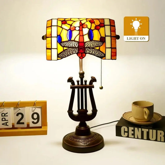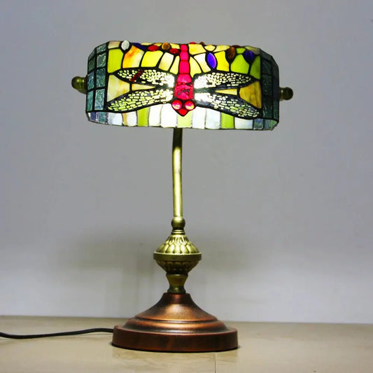 Retro Tiffany Reading Lamp Stained Glass Dragonfly Lampshade Banker Light